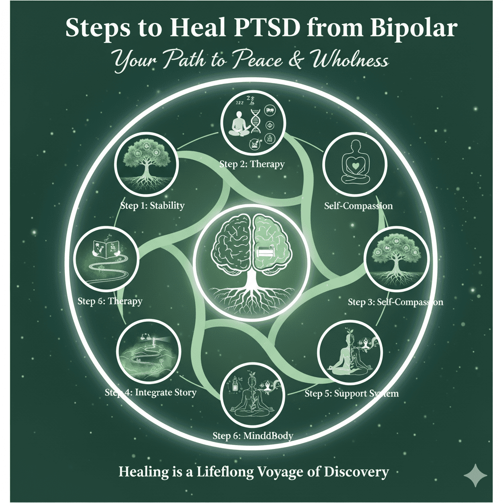 There’s no fixed timeline. Healing from PTSD caused by bipolar disorder is deeply personal and depends on factors like the severity of trauma, support systems, and treatment consistency. With steady therapy, medication, and self-care, many people notice improvements within months, but emotional integration and self-trust can take longer. Remember: healing is not a race—it’s a journey.